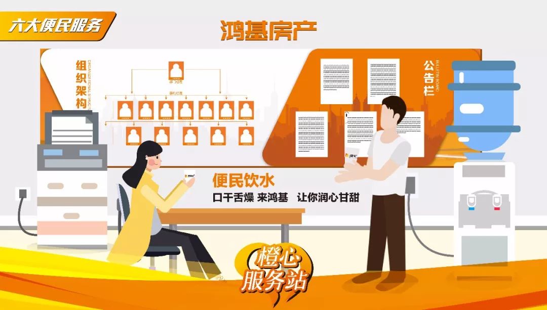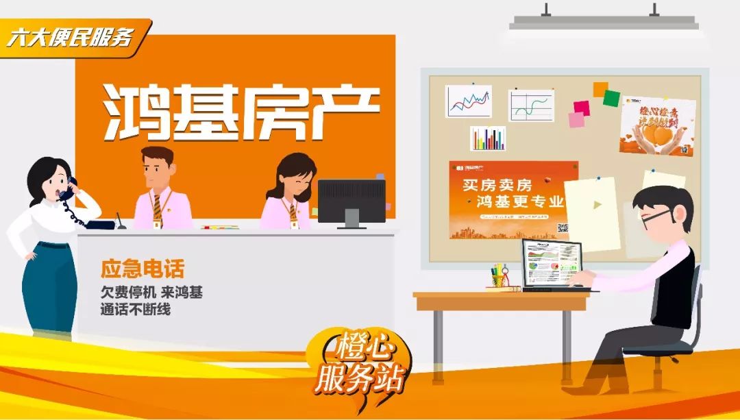 当你发现 手机欠费被停机, 别担心,来鸿基橙心服务站吧~ 这里免费提供应急电话 从此工作不耽误 当你口干舌燥时, 别担心,来鸿基橙心服务站吧~ 这里有免费的饮水提供 端起热情的工作人员递来的水, 一杯入喉,滋润心田 当你走在路上, 发现手机只剩一格电的时候, 别担心,来鸿基橙心服务站吧~ 这里有多功能的充电线 让你有电无忧